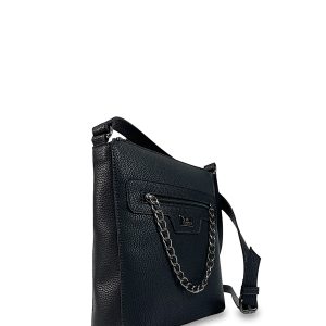 Γυναικεία τσάντα χιαστί Rock Μαύρο με κλείσιμο με φερμουάρ και εξωτερική θήκη με φερμουάρ. Διαθέτει εσωτερική θήκη με φερμουάρ και ρυθμιζόμενο λουράκι για χιαστί. Έχει χαρακτηριστική ανάγλυφη υφή και μεταλλικά στοιχεία σε μαύρο nikel.